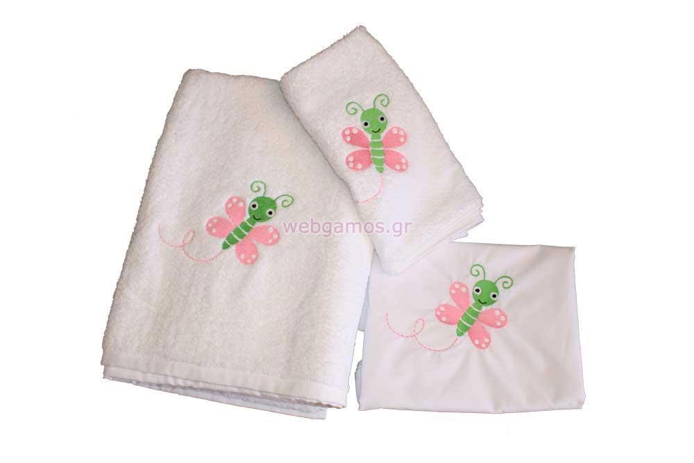 Λαδόπανα ελληνικής κατασκευής άριστης ποιότητας κεντημένα με πεταλουδίτσες. Το σετ περιλαμβάνει πετσέτα μικρή και μεγάλη, σεντονάκι και σετ εσώρουχα.