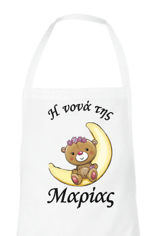 Λευκή ποδιά για το νονό ή τη νονά, εκτυπωμένη με θέμα "Αρκουδάκι Φεγγάρι". Γράψτε στα σχόλια μέσα στο καλάθι το όνομα του παιδιού σας.