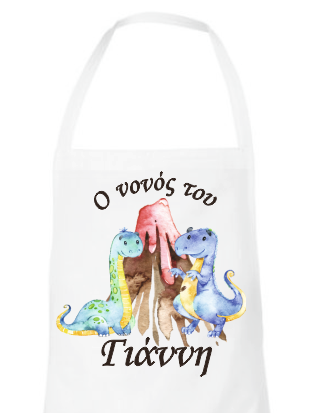 Λευκή ποδιά για το νονό ή τη νονά, εκτυπωμένη με θέμα "Δεινόσαυροι". Γράψτε στα σχόλια μέσα στο καλάθι το όνομα του παιδιού σας.