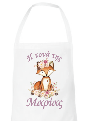 Λευκή ποδιά για το νονό ή τη νονά, εκτυπωμένη με θέμα "Forest Friends Αλεπού". Γράψτε στα σχόλια μέσα στο καλάθι το όνομα του παιδιού σας.