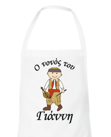 Λευκή ποδιά για το νονό ή τη νονά, εκτυπωμένη με θέμα "Κρητικός". Γράψτε στα σχόλια μέσα στο καλάθι το όνομα του παιδιού σας.