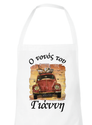 Λευκή ποδιά για το νονό ή τη νονά, εκτυπωμένη με θέμα "Σκαραβαίος". Γράψτε στα σχόλια μέσα στο καλάθι το όνομα του παιδιού σας. Σε κόκκινο ή σιέλ χρώμα.
