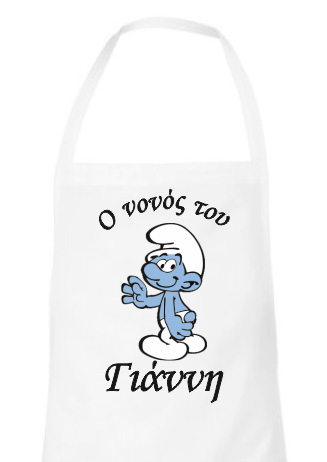 Λευκή ποδιά για το νονό ή τη νονά, εκτυπωμένη με θέμα "Στρουμφάκι". Γράψτε στα σχόλια μέσα στο καλάθι το όνομα του παιδιού σας.