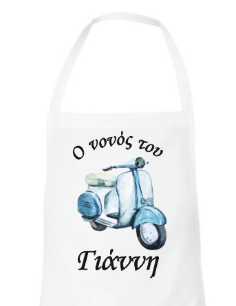 Λευκή ποδιά για το νονό ή τη νονά, εκτυπωμένη με θέμα "Βέσπα". Γράψτε στα σχόλια μέσα στο καλάθι το όνομα του παιδιού σας.