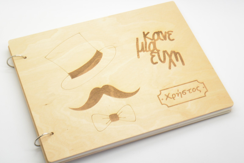 Βιβλίο ευχών βάπτισης με θέμα μικρός κύριος με ξύλινο εξώφυλλο χαραγμένο με laser. Η διάσταση του είναι 28.5 x 22 εκ και περιέχει 30 σελίδες. Μπορεί να γίνει σε ότι θέμα θέλετε καθώς και να χαρακτεί το όνομα του παιδιού σας.