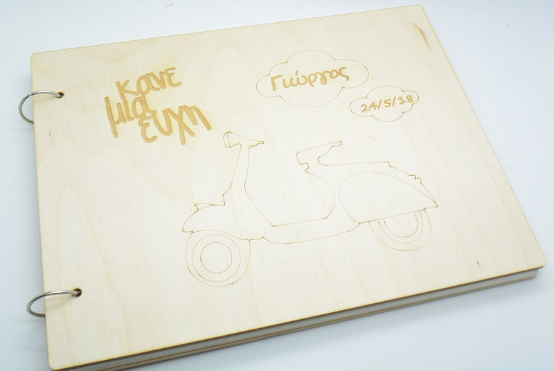 Βιβλίο ευχών βάπτισης με θέμα βέσπα με ξύλινο εξώφυλλο χαραγμένο με laser. Η διάσταση του είναι 28.5 x 22 εκ και περιέχει 30 σελίδες. Μπορεί να γίνει σε ότι θέμα θέλετε καθώς και να χαρακτεί το όνομα του παιδιού σας.