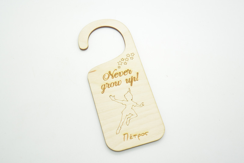 Διακοσμητικό πόρτας για μπομπονιέρα με θέμα πίτερ παν. Διάσταση 6 x 15 εκ. Μπορεί να χαρακτεί το όνομα του μωρού.