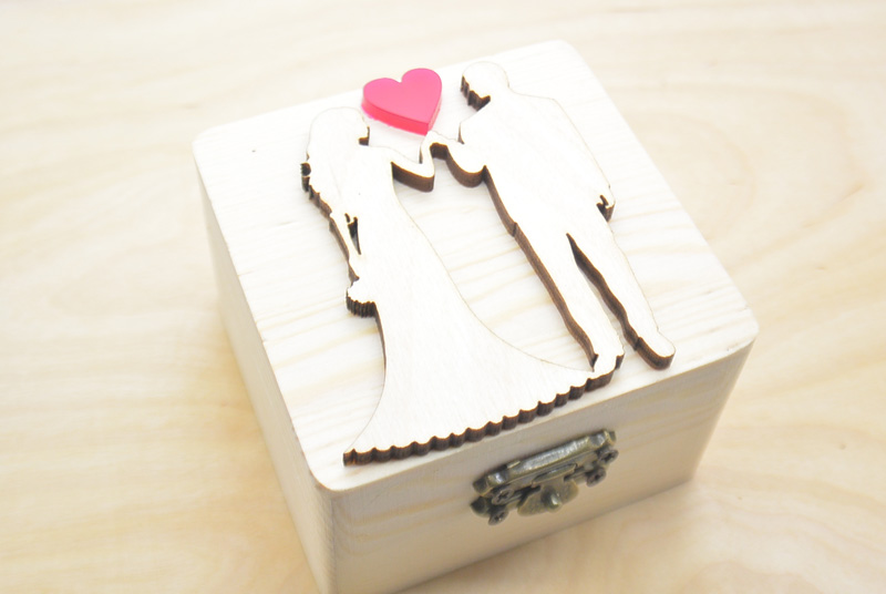 Ξύλινο κουτί με σχέδιο ζευγάρι και καρδιά . Διάσταση κουτί 8 x 8 x 5 cm. Με επιπλέον 0.3 λεπτά μπορεί να γίνει δεμένη μπομπονιέρα με 5 κουφέτα αμυγδάλου.