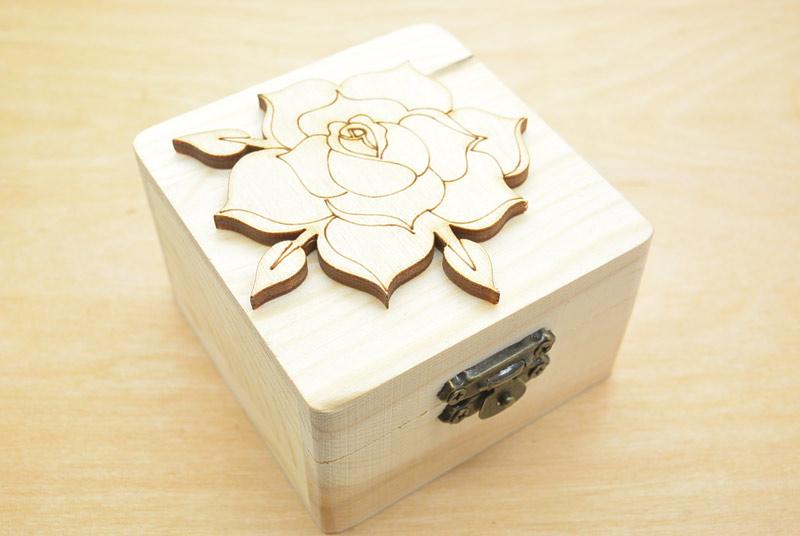 Μπομπονιέρα Ξύλινο κουτί τριαντάφυλλο. Διάσταση 8 x 8 x 5 cm. Η τιμή αφορά δεμένη μπομπονιέρα με 5 κουφέτα αμυγδάλου.