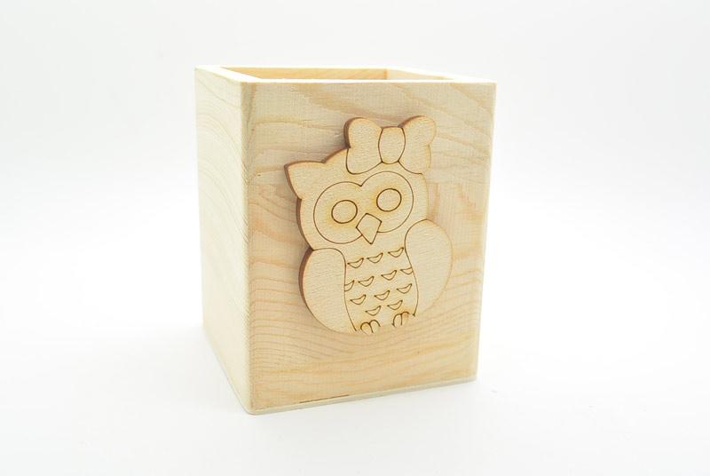 Μπομπονιέρα Ξύλινη Μολυβοθήκη κουκουβάγια. Διάσταση 8 x 8 x 10 εκ. Η τιμή αφορά σκέτο το αντικείμενο. Απο το υπομενού μπορείτε να επιλέξετε με επιπλέον χρέωση να γίνει δεμένη μπομπονιέρα με 5 κουφέτα αμυγδάλου ή 9 smarties.