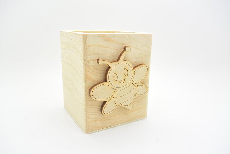 Μπομπονιέρα Ξύλινη Μολυβοθήκη μέλισσα με διάσταση 8 x 8 x 10 εκ. Η τιμή αφορά σκέτο το αντικείμενο. Απο το υπομενού μπορείτε να επιλέξετε με επιπλέον χρέωση να γίνει δεμένη μπομπονιέρα με 5 κουφέτα αμυγδάλου ή 9 smarties.