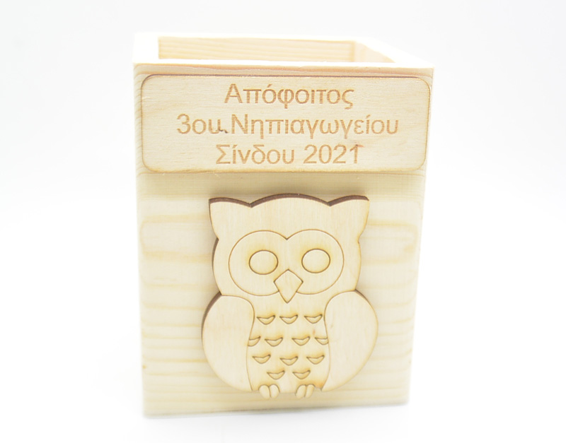 Αναμνηστική Μολυβοθήκη κουκουβάγια αποφοίτησης με τα στοιχεία του εκάστοτε σχολείου.Μπορεί η κουκουβάγια να γίνει με φιόγκο για τα κορίτσια. Διάσταση 8 x 8 x 10 εκ.