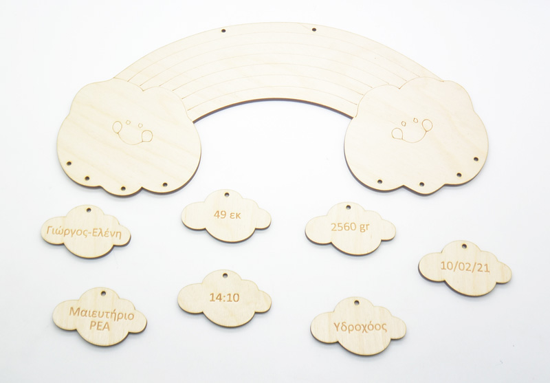 Αναμνηστικό Γέννησης ουράνιο τόξο με 7 συννεφάκια Μπορεί να χαρακτεί το νοσοκομείο γέννησης, ημερομηνία, ώρα, κιλά και εκατοστά γέννησης κ.α. Διαστάσεις 30 x 14,5 το ουράνιο τόξο και 6 x 3,8 εκ τα συννεφάκια.