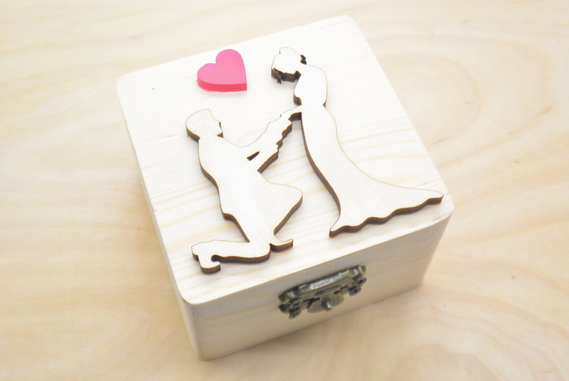 Ξύλινο κουτί με σχέδιο ζευγάρι και καρδιά . Διάσταση κουτί 8 x 8 x 5 cm. Με επιπλέον 0.3 λεπτά μπορεί να γίνει δεμένη μπομπονιέρα με 5 κουφέτα αμυγδάλου.