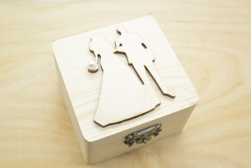 Ξύλινο κουτί με σχέδιο ζευγάρι με πέρλα. Διάσταση κουτί 8 x 8 x 5 cm. Με επιπλέον 0.3 λεπτά μπορεί να γίνει δεμένη μπομπονιέρα με 5 κουφέτα αμυγδάλου.