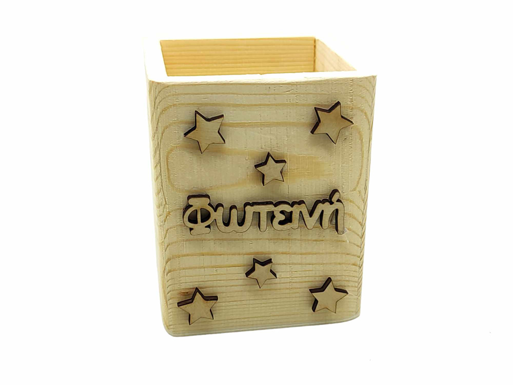 Μπομπονιέρα Ξύλινη Μολυβοθήκη με όνομα και αστέρια με διάσταση 8 x 8 x 10 εκ. Η τιμή αφορά σκέτο το αντικείμενο με το ίδιο όνομα. Απο το υπομενού μπορείτε να επιλέξετε με επιπλέον χρέωση να γίνει δεμένη μπομπονιέρα με 5 κουφέτα αμυγδάλου ή 9 smarties.