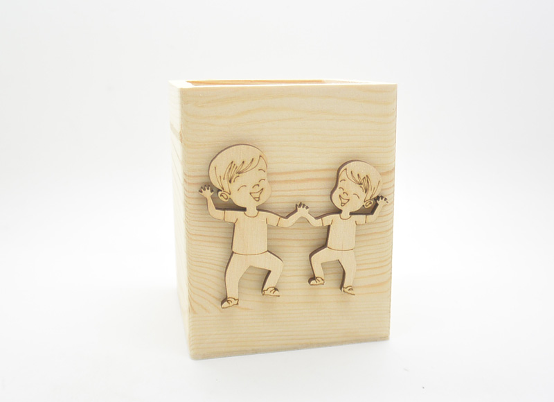 Μπομπονιέρα Ξύλινη μολυβοθήκη παιδάκια δίδυμα. Διαστάσεις 8 x 8 x 10 εκ.