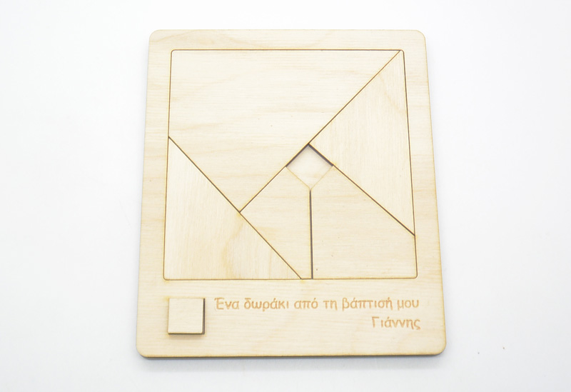 Μπομπονιέρα Ξύλινο παζλ Tangram με αφιέρωση και όνομα. Διάσταση 14 x 12 cm. Μπορεί να χαρακτεί όποιο θέμα θέλετε, αφιέρωση όπως και το όνομα του παιδιού σας. Έρχεται έτοιμο μέσα σε διάφανο σακουλάκι.