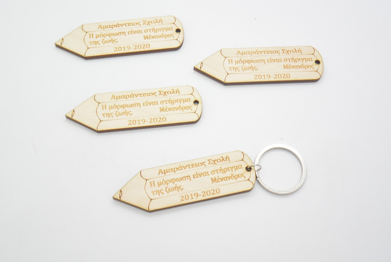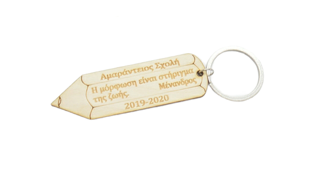 Μπρελόκ αναμνηστικό με το όνομα του σχολείου και απόφθεγμα του Μένανδρου. Διάσταση 11 εκ.