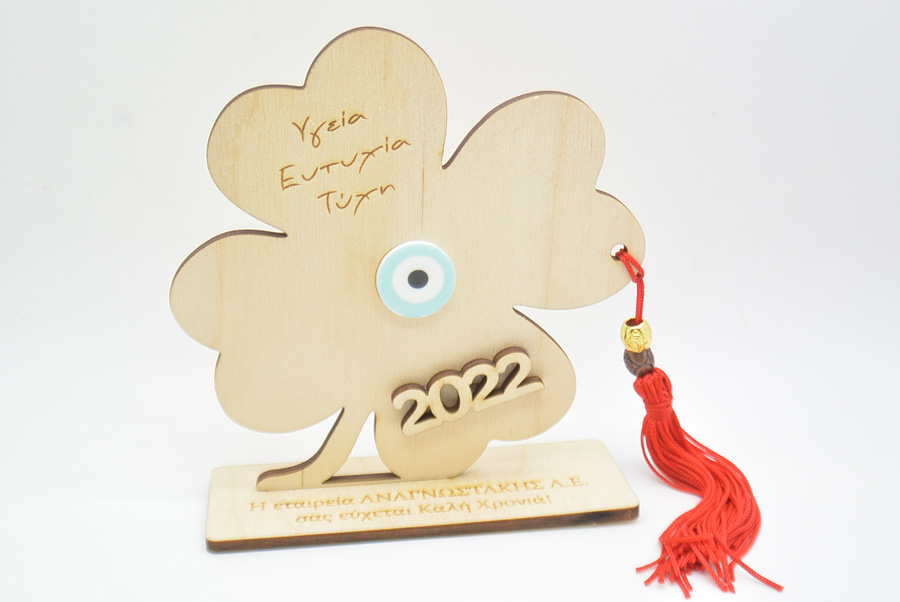 Εταιρικό Γούρι τριφύλλι με διάσταση 12,3 x 12 εκ. Στην βάση μπορεί να αναγραφεί η αφιέρωση της εταιρείας σας.