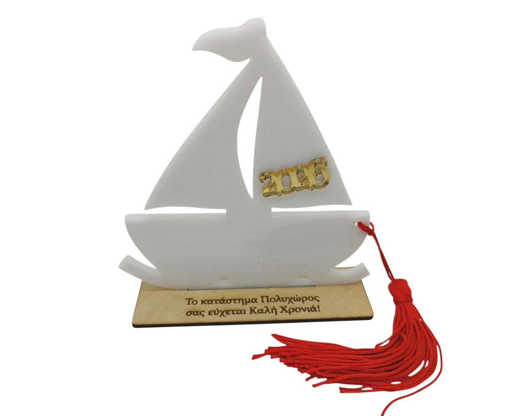 Γούρι καράβι από plexiglass λευκό με χρυσή χρονολογία καθρέπτη στο πλάι και φούντα κοκκίνη, επίσης ξύλινη βάση με αφιέρωση της επιλογής σας. Με διαστάσεις 12 x 12 εκ.