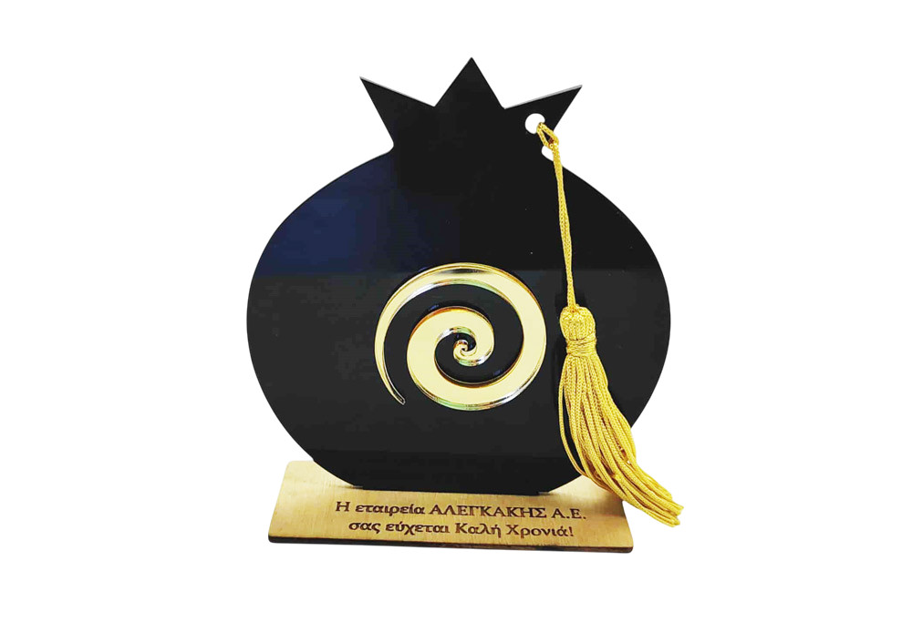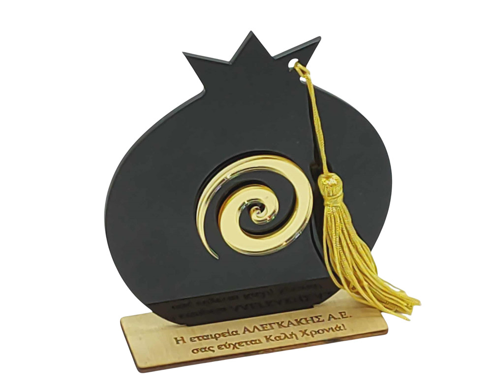 Γούρι ρόδι από plexiglass μαύρο με χρυσή σπείρα καθρέπτη στην μέση και φούντα χρυσή, επίσης ξύλινη βάση με αφιέρωση της επιλογής σας. Με διαστάσεις 12 x 11 εκ.