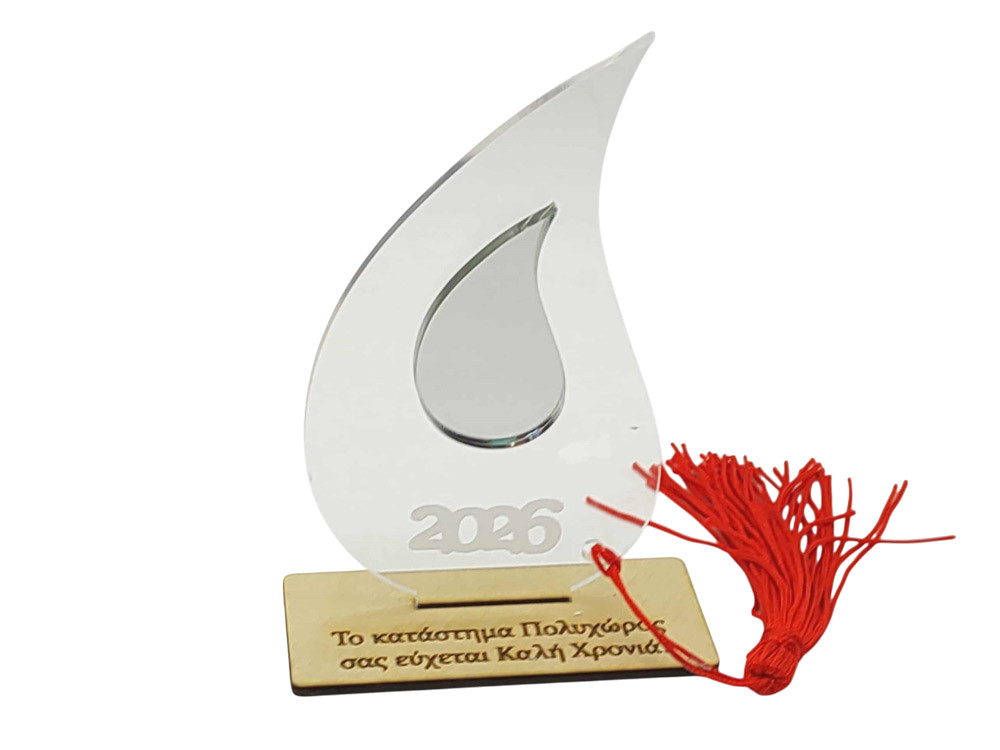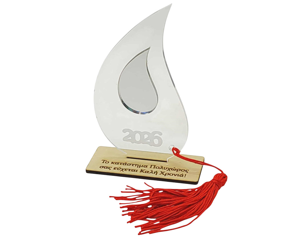 Γούρι σταγόνα από plexiglass διάφανο με ασημί σταγόνα καθρέπτη στην μέση με χαραγμένη την χρονολογία από κάτω και φούντα κοκκίνη, επίσης ξύλινη βάση με αφιέρωση της επιλογής σας. Με διαστάσεις 12 x 7 εκ.