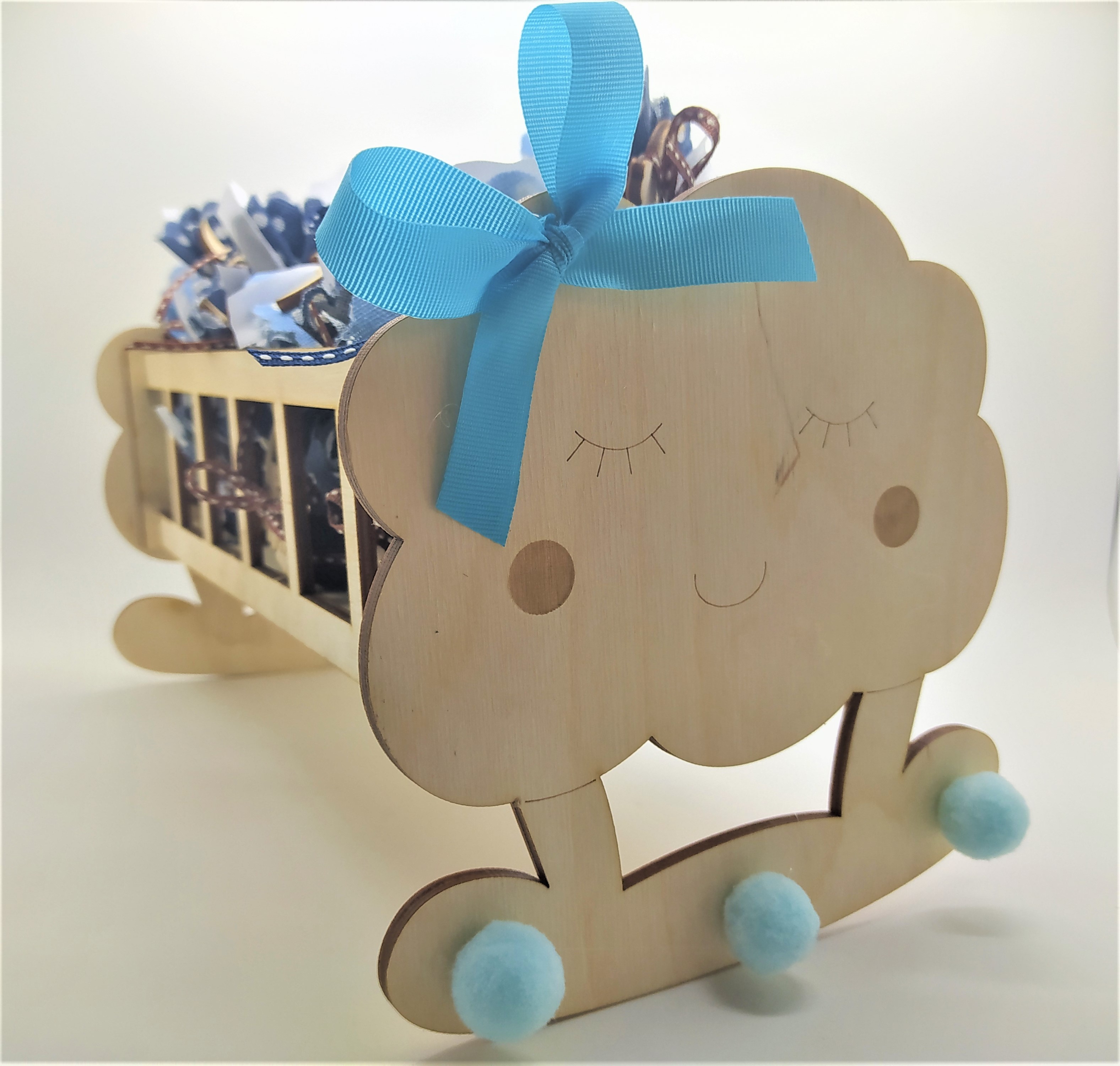 Σταντ καλάθι κούνια για κεράσματα γέννας με διάσταση 16 x 16 x 25 εκ σε σιέλ ή ροζ χρώμα. Μπορεί να χωρέσει περίπου 50 με 100 τεμάχια. Μπορεί να χρησιμοποιηθεί μετά σαν παιχνίδι.
