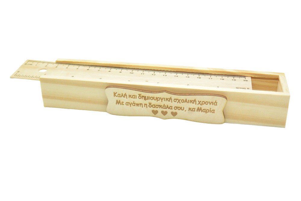 Ξύλινη Κασετίνα με χάρακα και αφιέρωση για το ξεκίνημα της νέας σχολικής χρονιάς, καλωσόρισμα των μαθητών σας. Με αφιέρωση της επιλογής σας και διαστάσεις 21 x 4 x 3 εκ.