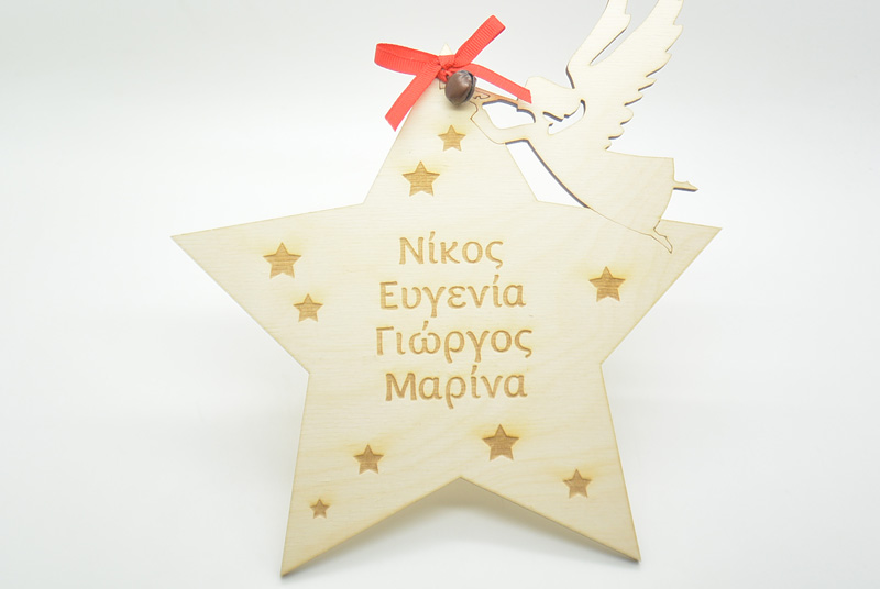 Ξύλινη κορυφή χριστουγεννιάτικου δέντρου αστέρι με σχέδιο αγγελάκι. Στο εσωτερικό γίνεται χάραξη τα ονόματα της οικογένειας. Διάσταση 23 x 21 εκ.