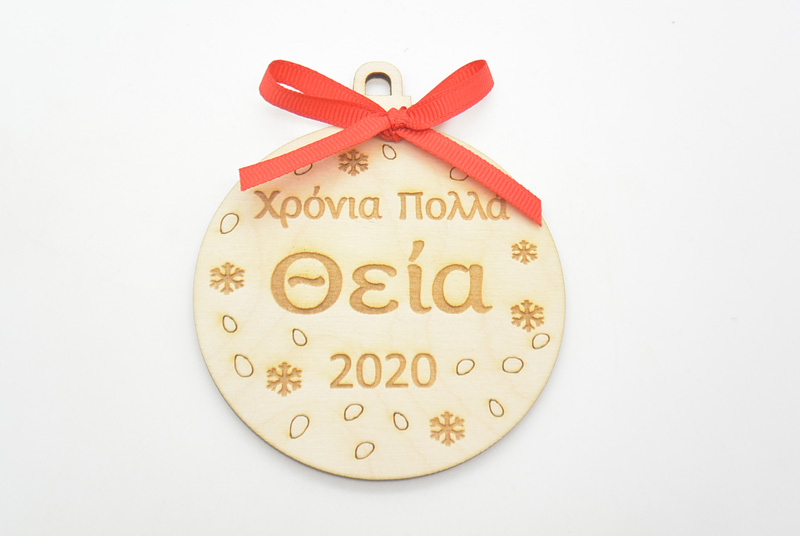 Ξύλινη Χριστουγεννιάτικη μπάλα χρόνια πολλά θεία με διάσταση 10 x 8.5 εκ.