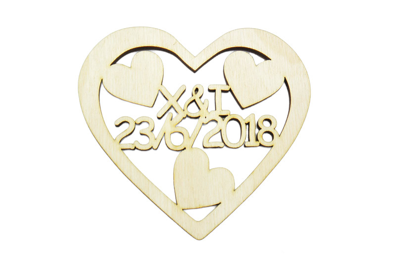 Ξύλινο Αναμνηστικό καρδιά με τα αρχικά του ζευγαριού και την ημερομηνία γάμου με διαστάσεις 15 x 14 εκ.