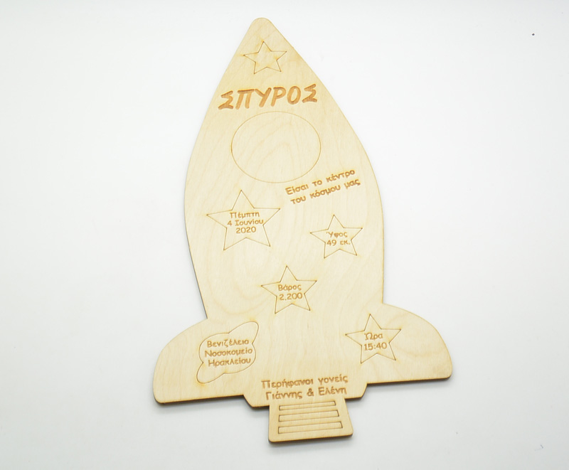 Ξύλινο Αναμνηστικό Γέννησης για τοίχο πύραυλος. Διάσταση 30 x 16 εκ. Το κείμενο μπορεί να αλλάξει και να μπει της επιλογής σας.