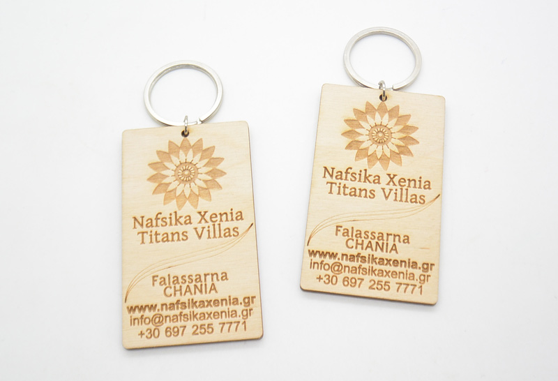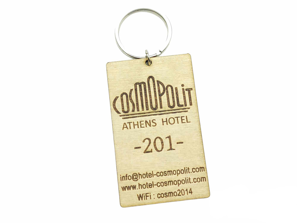 Ξύλινο Μπρελόκ για κλειδιά ξενοδοχείου με διάσταση ξύλινου 7.5 x 4.5 εκ και συνολικό μήκος με τον κρίκο 10.5 εκ. Μπορεί να γίνει σε ότι σχέδιο θέλετε.