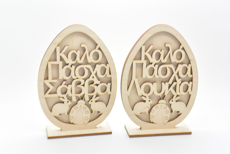 Ξύλινο Διακοσμητικό αυγό καλό Πάσχα με κείμενο της επιλογής σας με λαγουδάκια και πασχαλίτσα. Διάσταση 15 εκ.