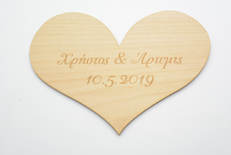 Ξύλινο Διακοσμητικό καρδιά με ονόματα και ημερομηνία με διαστάσεις 17 x 12,3 εκ.