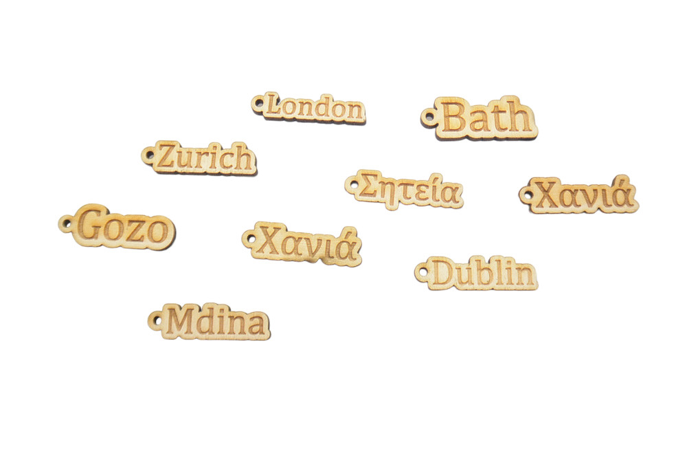 Ξύλινο Διακοσμητικό πόλεις του κόσμου με διαστάσεις 5 εκ μήκος και πλάτος ανάλογα τον αριθμό των γραμμάτων που έχει η πόλη από 1,3 μέχρι 2,5 εκ. Στο καλάθι στο πεδίο "Προσθήκη σχολίων για την παραγγελία" γράφετε της πόλεις που θέλετε.