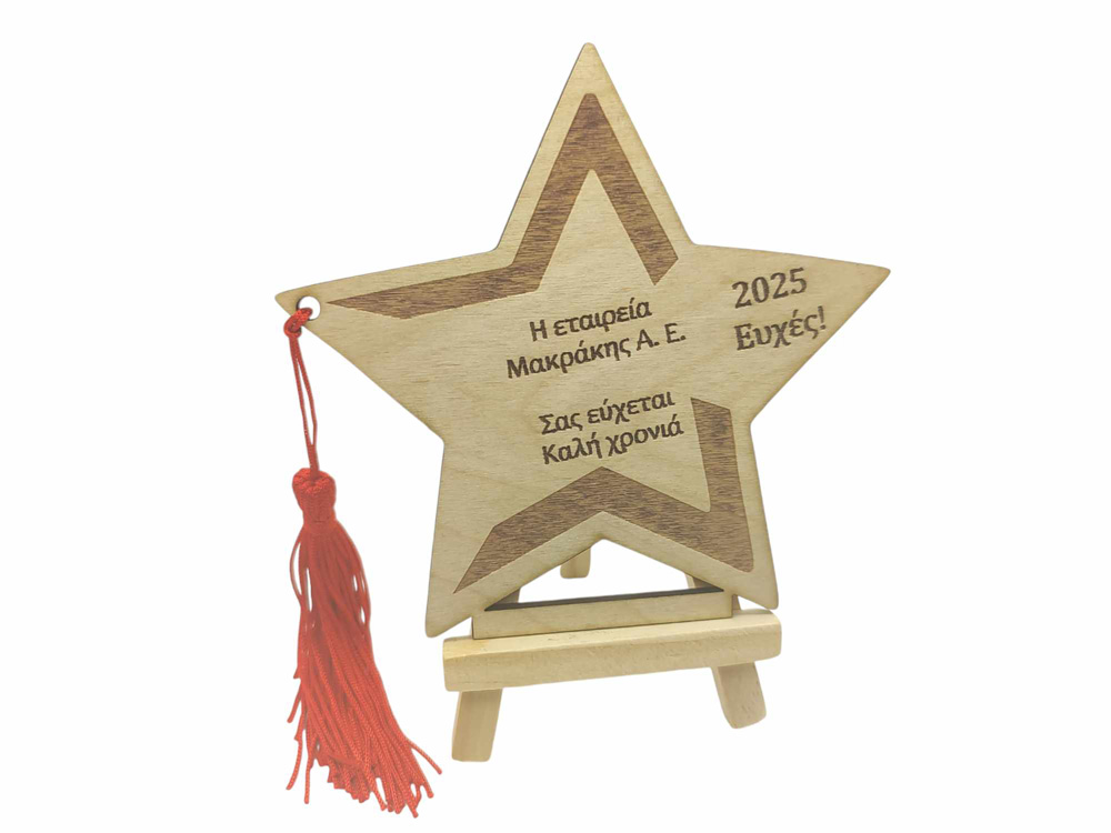 Ξύλινο Γούρι αστέρι με καβαλέτο και φούντα για συλλόγους με διαστάσεις 12 x 12 εκ και ύψος 15 εκ με το καβαλέτο. Μπορούμε να χαράξουμε το κείμενο της επιλογής σας, για επιχειρήσεις συλλόγους, συνδέσμους, σχολεία κτλ. Αποστέλλετε έτοιμο!!