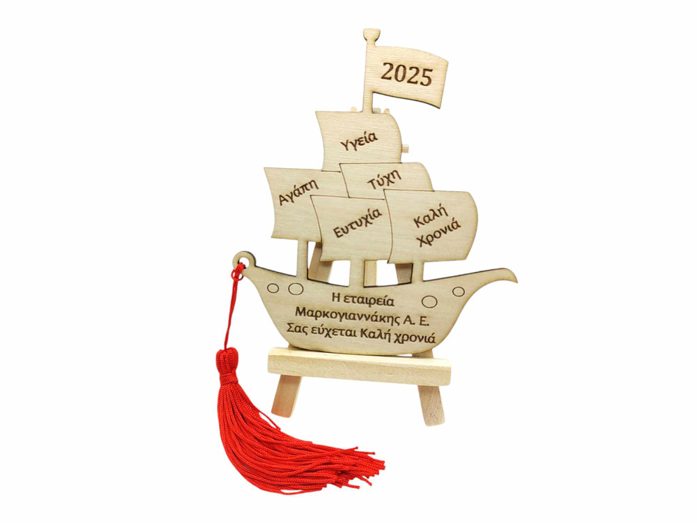 Ξύλινο Γούρι καράβι με καβαλέτο και φούντα για συλλόγους με διαστάσεις 12 x 11 εκ και ύψος 15 εκ με το καβαλέτο. Μπορούμε να χαράξουμε το κείμενο της επιλογής σας, για επιχειρήσεις συλλόγους, συνδέσμους, σχολεία κτλ. Αποστέλλετε έτοιμο!!