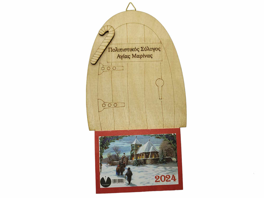 Ξύλινο Ημερολόγιο τοίχου με σχέδιο πόρτα για σχολεία και συλλόγους με διάσταση 21 μήκος μαζί με το ημερολόγιο x 11 εκ πλάτος. Μπορούν να χαρακτούν τα στοιχεία του εκάστοτε σχολείου ή συλλόγου. Η τιμή αφορά ποσότητες απο 50 εώς 200 τεμάχια. Στην τιμή περιλαμβάνονται όλα τα υλικά ξύλινο διακοσμητικό, ημερολόγιο και γαντζάκι για να κρεμαστεί. Με επιπλέον χρέωση 0,20 μπορείτε να το πάρετε έτοιμο κολλημένα τα στοιχεία απο εμάς.