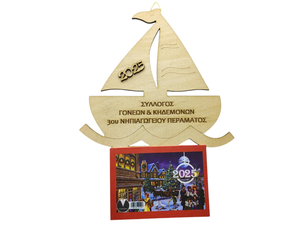 Ξύλινο Ημερολόγιο τοίχου καράβι για σχολεία και συλλόγους με διάσταση 21 μήκος μαζί με το ημερολόγιο x 16 εκ πλάτος. Μπορούν να χαρακτούν τα στοιχεία του εκάστοτε σχολείου ή συλλόγου. Η τιμή αφορά ποσότητες απο 50 εώς 200 τεμάχια. Στην τιμή περιλαμβάνονται όλα τα υλικά ξύλινο διακοσμητικό, ημερολόγιο και γαντζάκι για να κρεμαστεί. Με επιπλέον χρέωση 0,20 μπορείτε να το πάρετε έτοιμο κολλημένα τα στοιχεία απο εμάς.