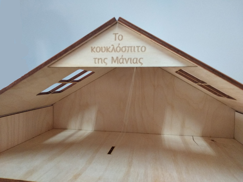 Ξύλινο Κουκλόσπιτο μεγάλο με διαστάσεις 50 x 53 x 21 εκ. Στο πάνω μέρος μπροστά στην σκεπή μπορεί να γραφτεί ¨ Το κουκλόσπιτο της(το ονομα του παιδιού σας).¨ Έρχεται συναρμολογημένο.