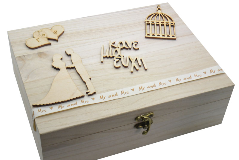 Ξύλινο Κουτί ευχών για γάμο με σχέδιο γαμπρός νύφη με τα αρχικά του ζευγαριού. Διαστάσεις κουτιού 32 x 25 x 11 εκ. Μπορεί να συνδιαστεί με ξύλινες καρδιές με επιπλέον χρέωση.