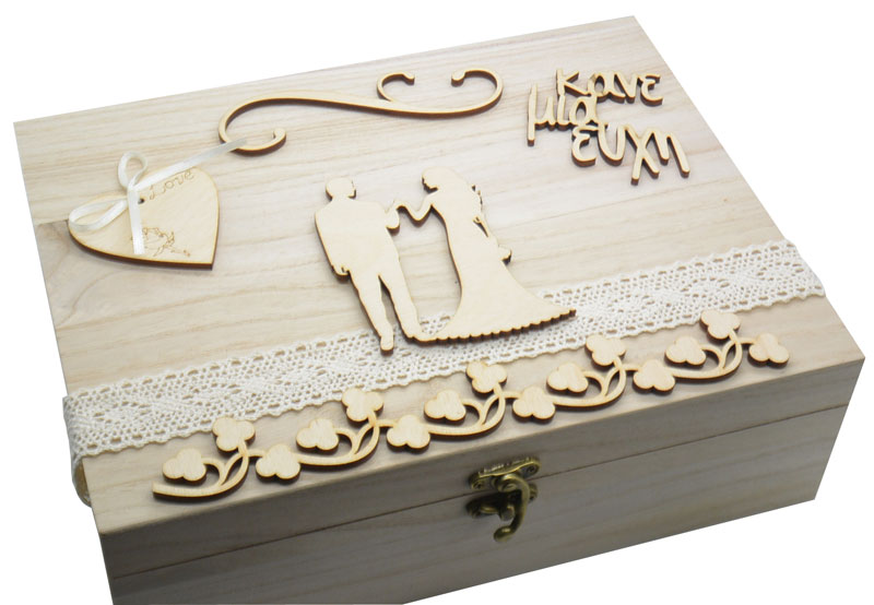Ξύλινο Κουτί ευχών για γάμο με σχέδιο γαμπρός νύφη. Διαστάσεις κουτιού 32 x 25 x 11 εκ. Μπορεί να συνδιαστεί με ξύλινες καρδιές με επιπλέον χρέωση.