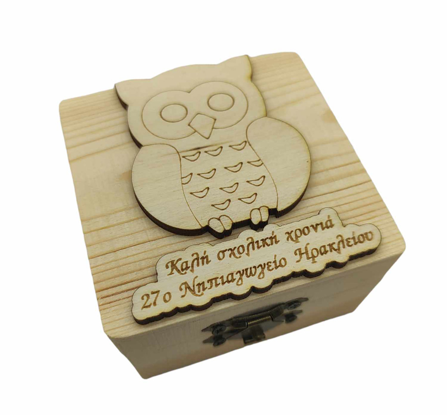 Ξύλινο Κουτί κουκουβάγια με αφιέρωση για το ξεκίνημα της νέας σχολικής χρονιάς, καλωσόρισμα των μαθητών σας. Με αφιέρωση της επιλογής σας και διαστάσεις 8 x 8 x 5 εκ.