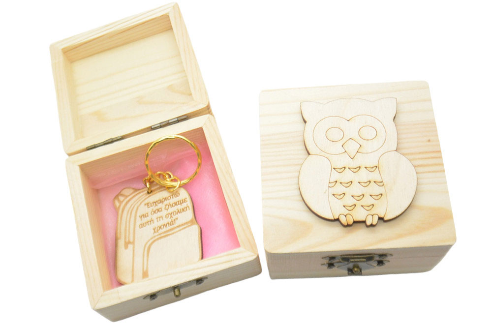 Ξύλινο κουτί κουκουβάγια με μπρελόκ τσάντα με αφιέρωση δώρο για τον εκπαιδευτικό του παιδιού σας. Διαστάσεις κουτιού 8 x 8 x 5 εκ και μπρελόκ 12 εκ με το ξύλινο.