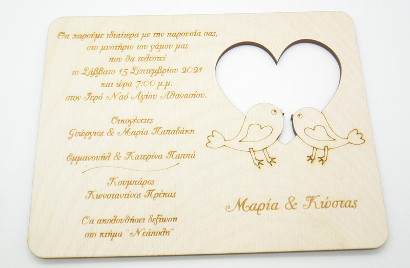 Ξύλινο Προσκλητήριο γάμου πουλιά καρδιά. Διάσταση προσκλητηρίου 14 x 11 εκ.
