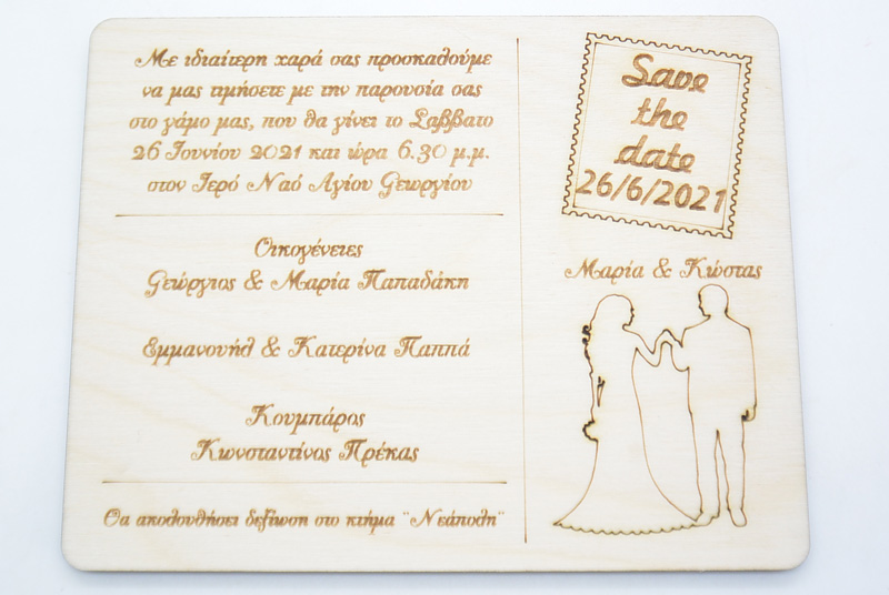 Ξύλινο Προσκλητήριο γάμου ζευγάρι. Διάσταση προσκλητηρίου 14 x 11 εκ.