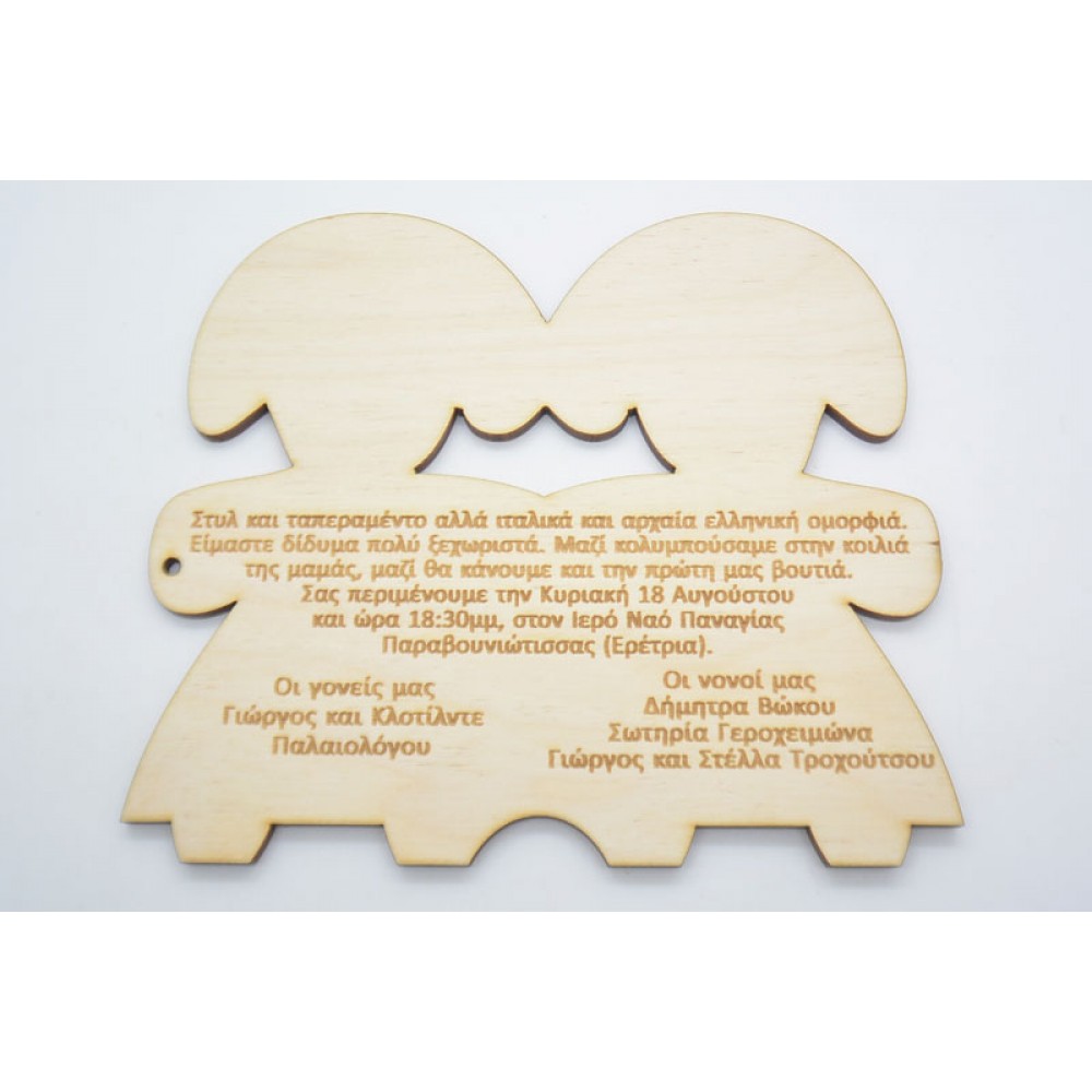 Ξύλινο Προσκλητήριο με θέμα δίδυμα κοριτσάκια. Διάσταση προσκλητηρίου 14 x 12 εκ.