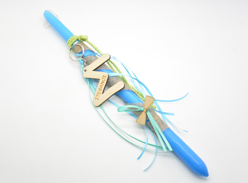 Πασχαλινή λαμπάδα με μπρελόκ μονόγραμμα. Στο μπρελόκ μπορεί να μπει το όνομα του παιδιού. Διατίθεται σε συσκευασία δώρου.